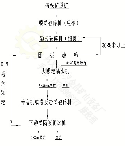 該工藝流程僅適用于要求預(yù)先回收粗粒硫鐵礦的硫鐵礦選礦廠,對于生產(chǎn)硫精砂的企業(yè)則無需如此復(fù)雜的工藝流程,只需經(jīng)過兩次破碎,破碎后的物料直接進入棒磨機或者細(xì)碎機細(xì)碎后進入下動式隔膜跳汰機分選即可獲得純凈的硫精砂。